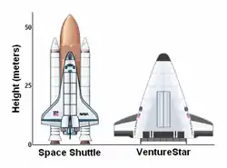 VentureStar was a single-stage-to-orbit reusable launch system proposed by Lockheed Martin and funded by the U.S. government. The goal was to replace the Space Shuttle by developing a re-usable spaceplane that could launch satellites into orbit at a fraction of the cost. While the requirement was for an uncrewed launcher, it was expected to carry passengers as cargo. The VentureStar would have had a wingspan of 68 feet (20.7 m), a length of 127 feet (38.7 m), and would have weighed roughly 1000 t (2.2 million lb).