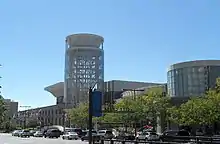 The Olympic Medals Plaza was located on the corner of South Temple and 300 West (block 85) in downtown Salt Lake City, within the Olympic Square. It was one of a few completely temporary venues, which was removed following the completion of both the 2002 Winter Olympics and 2002 Winter Paralympics. The site of the Medals Plaza is a parking lot owned by The Church of Jesus Christ of Latter-day Saints and is often used for temporary events. The Church donated free use of the property for the 2002 games, along with $5 million to transform the parking lot into an Olympic class Medals Plaza. On August 11, 1999, the same day the plaza's location was announced, a tornado hit downtown Salt Lake City, killing one man at the site of the future plaza.[66][67] Some of Salt Lake's citizens, including many in its City Council, had preferred Washington Square, near the City & County Building, or Pioneer Park as the location for the Medals Plaza. Nevertheless, the SLOC accepted the Church's offer because they were willing to help pay the costs, and the parking lot was an entire city block in size, which would allow a large number of spectators.[68] Construction on the plaza began December 3, 2001, and was finished as the plaza was unveiled to the press on January 25, 2002.[69]