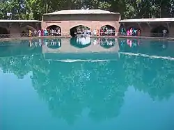 From the entrances, a walkway takes the visitor towards the octagonal pool, which is approached through a colonnade. This colonnade, composed of 24 arches, surrounds the pool, whose water comes from the spring deep below. The pool's water is clear and filled with carp. The water exits from the pool into the main axial water canal, which measures 305 meters long by 3.65 meters wide.[14]