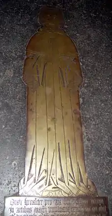 Arthur Vernon, priest and son of Anne Talbot and Henry Vernon, in the robes of a University of Cambridge MA, on his tomb in the floor of the Golden Chapel at Tong.