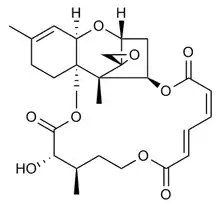 Verrucarin A belongs in the class of trichothecenes, a group of sesquiterpene toxins produced by several fungi, namely from the Fusarium species, that are responsible for infecting food grains. Within the skeleton of the basic trichothecene structure, the olefin and epoxide are crucial for toxicity; ester functionalities and hydroxyl groups often contribute to the toxicity, thereby rendering Verrucarin A as one of the most lethal examples. The mechanism of action for this class of toxins mainly inhibits protein biosynthesis by preventing peptidyl transferase activity. Although initially thought to be potentially useful as anticancer therapeutics, numerous examples of trichothecene derivatives were shown to be too toxic for clinical use.