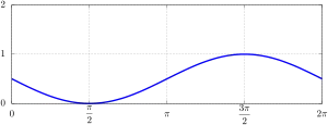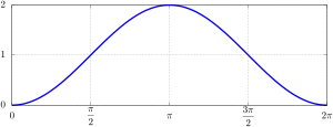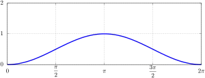 One period (0 < θ < π/2) of a versine or, more commonly, a haversine (or havercosine) waveform is also commonly used in signal processing and control theory as the shape of a pulse or a window function (including Hann, Hann–Poisson and Tukey windows), because it smoothly (continuous in value and slope) "turns on" from zero to one (for haversine) and back to zero.[nb 2] In these applications, it is named Hann function or raised-cosine filter. Likewise, the havercosine is used in raised-cosine distributions in probability theory and statistics.