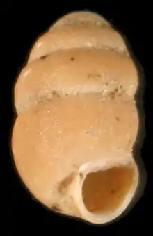The shell is very small, ovate, obtuse, indistinctly, spaced striate, glossy purplish brown. The shell has 4½ whorls, that are rather convex, high, rapidly increasing, joined by a somewhat impressed suture, the penult large, almost ventricose. Umbilical opening is moderate.[3]