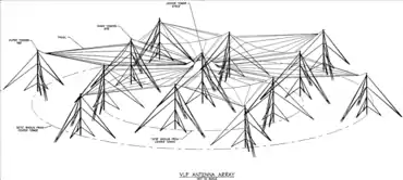 A "triatic" or "flattop" antenna, another common VLF transmitting antenna. It consists of vertical radiator wires each connected at top to parallel horizontal capacitive topload wires stretching up to a kilometer, supported on tall towers. The transverse support cables suspending the horizontal wires are called "triatics".