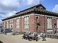 The building was designed by architect Hack Kampmann and was constructed between 1898 and 1902. It is prominently situated on a hill overlooking Aarhus River. The building is in National Romantic and historicist style, constructed from red bricks of lime and sandstone with a hip roof and a balcony.[6] It is adorned with many different types of frieze, bands and inscriptions. Above the front entrance is a relief showing a woman watering the Tree of Knowledge and along the eaves is a series of owls, symbolizing erudition and knowledge. The interior features designs by sculptor Karl Hansen Reistrup who also contributed to Aarhus Theatre.[7]