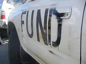 On 12 June 2005, KAN activists wrote the slogan "Jo Negociata - VETËVENDOSJE!" (Albanian for "No negotiations - SELF-DETERMINATION!") on the walls of UNMIK, marking the official transformation of KAN to Vetëvendosje. This was followed by the creation of Vetëvendosje centers in most municipalities of Kosovo and in countries with a significant Albanian diaspora. On 25 July 2005, Vetëvendosje activists distributed copies of the UN Resolution 1514 in front of the UNMIK headquarters. This was followed by other activities against UNMIK, which Vetëvendosje saw as an organization that did not represent the interests of the people of Kosovo. Vetëvendosje wanted independence for Kosovo based on the rights of the people for self-determination, which, according to Vetëvendosje, was guaranteed by the UN Resolution 1514.[17] Among the targets of Vetëvendosje activists were vehicles of UNMIK with UN signs, to which the activists added an F character at the beginning and a D character at the end resulting in FUND signs, which in Albanian means The End. Vetëvendosje also organized protests in front of the headquarters of the United Nations in both New York and in Kosovo during the visits of the heads of state of Serbia or negotiations' mediators.[18][19][20] Vetëvendosje activists threw rotten eggs at Boris Tadić, the president of Serbia, when he visited Kosovo. They also put red paint on the streets leading to the presidential residence of Kosovo when Martti Ahtisaari visited Kosovo, as a symbol for the blood spilled in the Kosovo war, which, according to Vetëvendosje, Ahtisaari was walking over with his plan.[17]