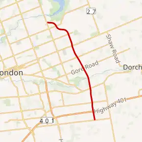 The parkway begins as a divided two-lane road the progresses northward through farm fields for 800 metres (870 yd) before crossing over Highway 401 at a partial cloverleaf interchange (Exit 194). It widens to four lanes north of the interchange and travels through empty fields, with several new industrial developments dotting the landscape, including a Dr. Oetker pizza factory.[1][4] It intersects Bradley Avenue and Hamilton Road before crossing the South Thames River.[1][3]