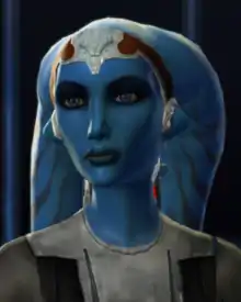Ce'na, better known by her alias Vette, is a fictional character in BioWare's massively multiplayer online role-playing game Star Wars: The Old Republic. The starting companion for players who select the Sith Warrior class, Vette is a Twi'lek, a humanoid species within the Star Wars's universe known for the twin tentacular appendages that protrude from the back of their heads. As the player character's slave, Vette comes with a shock collar that the player may either remove, or utilize to torture her. She is voiced by Catherine Taber.