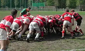 During the Second World War club actives were going on until 1943, when as an effect of the strategic bombing of Hannover the club's pitch was destroyed. In December 1945 Allied Control Council issued the "Directive 23-Limitation and Demilitarization of Sport in Germany"[2] which led to the termination of all German sports clubs. In Döhren only one club was allowed afterwards which served as the governing body for all sport activities. All three Döhren-based rugby clubs (FC Schwalbe Hannover, 06 Döhren, VfR Döhren) had to join. Due to relaxation of the policies on sport activities in 1947 FC Schwalbe became an independent club again. In the same year VfR Döhren and 06 Döhren merged and the still valid name "Verein für Rasenspiele 1906" was created.[3]