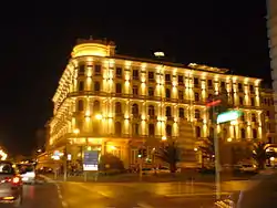 ![]() A view of one of Viareggio's Hotel Royal along the passeggiata ("promenade"), with the "Fountain of the Four Seasons" by Beppe Domenici in front. | |