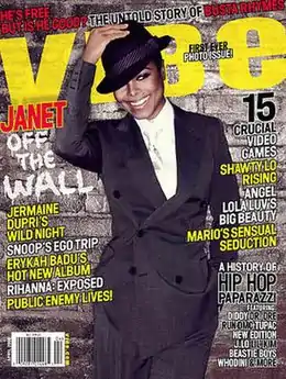 Vibe magazine was known for the creative direction of their covers.[14] R&B singer Mary J. Blige repeatedly was on the cover of Vibe with countless articles following her career. The trio TLC was photographed for the cover in firefighters' gear, referencing the fact that member Lisa Lopes burned down the house of then-boyfriend and NFL star Andre Rison. The first non-photograph cover of Vibe was an illustration of late singer Aaliyah by well-known artist/illustrator Alvaro; this was Aaliyah's first appearance on the cover as well. Other famous cover subjects are Trey Songz, Brandy, Snoop Dogg, Mariah Carey, Beyoncé, Amerie, Jennifer Lopez, Keyshia Cole, Janet Jackson, Lil Wayne, The Fugees, Eminem, T.I., R. Kelly, Michael Jackson (whom Quincy Jones' daughter Kidada had dressed in hip hop clothing, reportedly for the first and only time in the entertainer's career), Ciara, who also appeared on the cover numerous times and rap legend Tupac Shakur's famous cover story in which he reveals important details about his non-fatal 1994 NYC shooting (two years before his death in Las Vegas, Nevada).[15] Electro-rapper Kesha became the first white female artist to appear on the cover as a solo act in October 2012.[16][17][18]