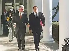 The ticket increased in popularity after the candidates traveled with their wives, Hillary and Tipper, on a "six-day, 1,000-mile bus ride, from New York to St. Louis."[7] Gore also successfully debated against the other vice presidential candidates, Dan Quayle (a longtime colleague from the House and the Senate) and James Stockdale. The result of the campaign was a win by the Clinton-Gore ticket (43%) over the Bush-Quayle ticket (38%).[8] Clinton and Gore were inaugurated on January 20, 1993 and were re-elected to a second term in the 1996 election.