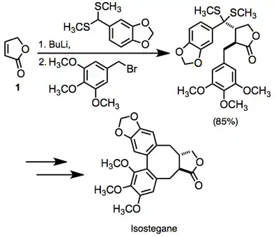 A large number of examples of vicinal difunctionalization of unsaturated carbonyl compounds exist in the literature. In one example, the difunctionalization of unsaturated lactone 1 was employed en route to isostegane. This transformation was accomplished in one pot.[14]