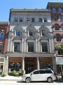 The Vickery Building stands on the east side of Water Street in downtown Augusta, just north of the Doughty Block, and opposite the Key Plaza. It is a four-story masonry structure, with a three-bay granite facade decorated in a commercial Italianate style. The ground floor has a central recessed entrance flanked by Ionic columns, with display windows on either side, framed by wooden elements with panels above. Second-floor window bays are articulated by paired fluted pilasters and topped by pedimented gables. Third-floor windows are set in rectangular openings surrounded by keystoned arches set on capitals that top the paired pilasters of the second level. The fourth floor bays each have two sash windows in simple openings, and the building has an elaborate cornice topped by a decorative parapet.[2]
