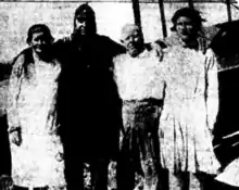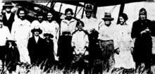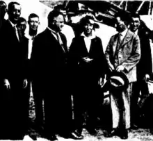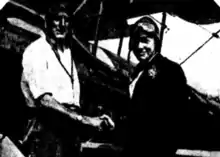 A civic reception was also held in Dingo on 23 November 1921.[37] Roffey flew from "Melbadale" to Dingo with his father as a passenger to attend the reception.[37] When Roffey attempted to land his plane in the main street of Dingo, he collided with a parked car and two gate posts as he attempted to navigate around the obstacles in the street.[37][38] Despite this, his fellow members from the Dingo Cricket Club hoisted him up on their shoulders and took him to the Dingo Hall where the civic reception was being held.[37]