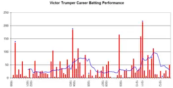 Some notable highlights of Trumper's career include scoring 292 against Tasmania, including a century before lunch (1908); scoring 100 in 58 minutes against Victoria (1906); 201 against South Australia (1913).[2] His innings of 293 for an Australian XI against Canterbury (1914), scored in a little over three hours, was made in partnership with Arthur Sims (184 not out), and their stand of 433 still remains the record for the eighth wicket in first-class cricket, and Trumper's innings remains the highest score by a number nine batsman.[7] His last 68 first-class innings, from 1910 to 1914, gave him an average of 60. His ability as a batsman, however, cannot be valued by averages or the number of runs scored. His mastership was shown on bad wickets, for when other batsmen were struggling merely to keep their wickets intact, he was still able to time the ball and execute strokes all round the wicket.