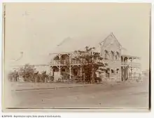 The Victoria Hotel was built by Ellen Ryan, one of the Territory's wealthiest women, who owned land and several mining leases. In 1888 Ryan moved into the Territory hotel trade, lodging a successful application with the licensing board for a prestigious hotel to be built at 27 Smith Street in central Darwin, then known as Palmerston, during the northern Australia gold rushes of the 1870s onwards.[1][2] Constructed by H.C. Debross, it was built for £4,000 and was the first stone building in Darwin.[3] The two-storey hotel was made of local, multi-coloured porcellanite stone, with a facade dominated by a parapetted gable and verandahs.[4] Upon completion, the building dominated Smith Street and remained that way for over half a century.[5]