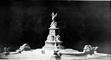 On 26 March the decision was announced to locate the Memorial outside Buckingham Palace and slightly shorten The Mall. It was estimated that the work would cost £250,000 and decided that there would be no grant given by the Government to the construction.[13] Once the site was selected, a competition was conducted for the design.[14] Five architects were chosen to develop designs.[15] This phase lasted until the beginning of July 1901, when the committee selected its primary choice for the construction and took it to the King for approval.[14] It was announced on 21 October 1902 that Thomas Brock had been chosen as the designer. The expectation was that the memorial would cost £200,000.[16][17]