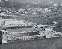 The indoor swimming complex, which was built at a cost of nearly HK$800 million and opened in September 2013,[39] is located in the park's eastern section, on the location of the Old Victoria Park Swimming Pool.[40] It includes two pools with 2,500-seat spectator stands and an electronic scoreboard, as well as changing rooms, showers, restrooms, and wheelchair lifts.[41][42] The Old Victoria Park Swimming Pool was opened with the park itself in 1957 and was the first public swimming pool in Hong Kong.[40]