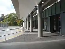 Victoria Park Station consists of a concourse at grade where fare control takes place, elevated platforms for subway trains, and a large outdoor bus transfer area. The present bus terminal was completed in 2011 by Stevens Group Architects, with Brown and Storey Architects, landscape architect Scott Torrance, and the TTC's internal design department on the 2008–2011 renovation of the station.[6] It replaced the original enclosed bus terminal, which was an oversized concrete structure with a series of bus bays sheltered by arched roofs.[7] This transfer area is a plaza with a pedestrian walkway that is sheltered by a massive concrete canopy which arches out of a central row of columns. The canopy is perforated with circular openings in certain places for a whimsical effect of lightness, breaking up its shadows on sunny days.