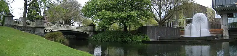 The first simple bridge over the Avon River in the square was built in March 1852; it was variably known as Papanui Bridge and Market Place Bridge.[12] It was replaced in September 1864 with a permanent structure and renamed Victoria Bridge.[13] In October 1877, Gould senior presented a petition to the city council to have Whately Road renamed to Victoria Street, which was acceded to.[14]