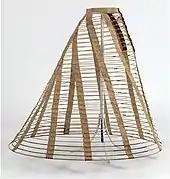 Nevertheless, in 1856, skirts expanded even further; creating a dome shape, due to the invention of the first artificial cage crinoline. The purpose of the crinoline was to create an artificial hourglass silhouette by accentuating the hips, and fashioning an illusion of a small waist; along with the corset. The cage crinoline was constructed by joining thin metal strips together to form a circular structure that could solely support the large width of the skirt. This was made possible by technology which allowed iron to be turned into steel, which could then be drawn into fine wires.[1] Although often ridiculed by journalists and cartoonists of the time as the crinoline swelled in size, this innovation freed women from the heavy weight of petticoats and was a much more hygienic option.[7]