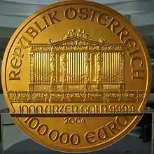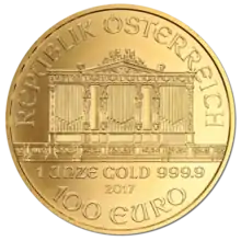 The Vienna Philharmonic (German: Wiener Philharmoniker), often shortened to Philharmonic, is a bullion coin of gold, silver, or platinum produced by the Austrian Mint (Münze Österreich). The coin is named for the Vienna Philharmonic orchestra, which inspired the design of both sides. It was introduced in 1989 as a one-troy ounce (ozt), gold coin with a face value of 2,000 Austrian schillings. It is generally one of the world's best selling bullion coins.[1][2] In 2002, with the adoption of the euro currency, the nominal value of the one-ounce coin was changed to 100 euros. In 2008, the Mint introduced a one-ounce silver version of the coin with a nominal value of 1.50 euros. The silver coin is also one of the top selling bullion coins, ranked third in 2013.[1] In 2016, the mint introduced a one ounce platinum coin with a face value of 100 euros.[3]