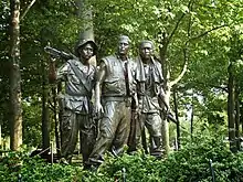 The Vietnam Veterans Memorial is a U.S. national memorial in Washington, D.C., honoring service members of the U.S. armed forces who fought in the Vietnam War. The 2-acre (8,100 m2) site is dominated by a black granite wall engraved with the names of those service members who died as a result of their service in Vietnam and South East Asia during the war. The wall, completed in 1982, has since been supplemented with the statue The Three Soldiers and the Vietnam Women's Memorial.