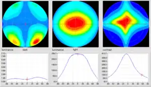 Fig. 5 shows luminance and contrast versus viewing direction in a polar coordinate system. The left column shows the directional luminance distribution of the dark state of the display (here: IPS-LCD), the center column shows the bright state and the right column shows the (luminance) contrast (ratio) resulting from the preceding two luminance distributions. The value is coded by (pseudo) colors. The graphs below the polar coordinate systems each show a cross section in the horizontal plane and indicate the values for luminance and for the contrast.