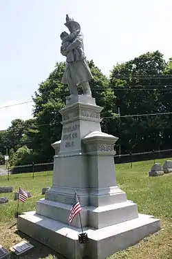 Erected in 1909 and dedicated on September 16, 1909, the Vigilant Fire Company Fireman's Monument is a 16-foot-high granite monument on a concrete base, which is situated on a plot of land chosen by the fire company for its visibility from the highway. Crafted by local stone mason Frank Scheirer at a cost of $2,200, the monument incorporates a 7-foot-tall statue of an early 20th-century fireman with a handlebar mustache, pointed fire hat, fire coat and boots, and holding a young girl in both arms. Arthur Scranton, a member of the Vigilant Fire Company, was responsible for the erection of the monument, according to the monument's dedication plaque.[2]