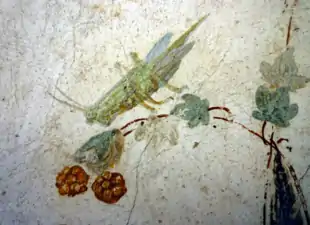 Immediately to the west of the triclinium is a large oecus, which was the main living room of a Roman house. Like the caldarium frescoes, the room is also painted in the Second Style. The east wall includes some wonderful details such as a theatre mask and peacock.[12]