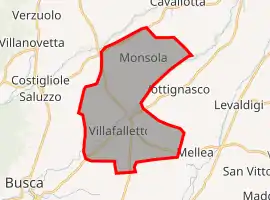 Villafalletto is a comune (municipality) in the Province of Cuneo in the Italian region Piedmont, located about 60 kilometres (37 mi) south of Turin and about 20 kilometres (12 mi) north of Cuneo.