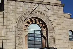 Detail of main entrance arch. In the intrados of the arch are half-menorahs. Above those, seven Moorish-style openings with medallions are arranged in a semicircle.