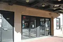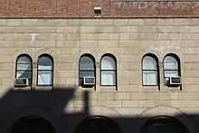 On the building's Second Avenue elevation, the first two stories consist of a double-height arcade with seven arches, each corresponding to one bay. The main entrance is in the second-northernmost bay and is taller and wider than the others. This bay contains a large archway surrounded by panels with geometric and foliate decorations.[8] There are four metal-and-glass doors at the ground floor, with a projecting triangular marquee sign above.[15] The marquee was originally rectangular and had decorations at its corners.[16] To the left (south) of the main entrance is a door to the upper office stories, topped by a lintel with the inscribed words "Jaffe Art Theatre Bldg". To the right (north) is a sign board and a cornerstone, containing an inscription of the Gregorian date May 23, 1926, in English and the corresponding Hebrew calendar date in Hebrew.[15] The intrados, near the top of the arch, contains capitals shaped like half-menorahs.[12][15] Above those, seven Moorish-style openings with medallions are arranged in a semicircle.[4] The top of the entrance bay contains a cornice supported by round corbels.[15]