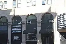 The other six arches are identical round-arched openings and are separated by paneled pilasters. The top of each pilaster contains a capital with foliate and geometric motifs and birds. The smaller arches formerly contained six storefronts one in each bay.[8] After the building was converted into a cinema in 1990, the northernmost bay was converted to an interior staircase, while the two bays immediately south of the main entrance became ticket counters. The remaining storefronts in the three southernmost bays contain aluminum storefronts at the first floor, as well as aluminum spandrel panels between the first and second floors.[15] At the third floor, there are two small arched windows in each bay. These are separated by pilasters with guilloche motifs, which are topped by capitals with foliate decorations.[8] The roof above the northernmost bay contains a small dormer unit, while the roof above the southern five bays is a terrace.[15]