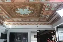 Originally, the main lobby had a floor made of terracotta, with a pattern of white rhombus motifs. The box office was on the north wall, while the south wall contained mirrored panels.[4] Only the original ceiling of the main lobby remains intact. The center of the ceiling contains a medallion; the edges of the ceiling contain a frieze with corbels, as well as decorative rectangular and square panels. During the early-1990s renovation, the lobby was expanded southward, and a concession stand and a wall of poster boards were installed.[19] The lobby also contains an exhibit about the history of Yiddish theatre.[23][22]