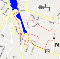 The most consistent boundary of the district is New York State Route 17M on its west, from Lake Street, including the entire mill pond and park, to a point a half-mile (1 km) west of its intersection with the Stage Road, now Orange County Route 19. A small area west of 17M, primarily along Stage but also including portions along Oakland, Mill and Ramapo streets, is included. The only other deviation from 17M is the exclusion of two large lots not part of Monroe Cemetery or the racetrack to the northeast of the 17M-Stage Road intersection.[1]