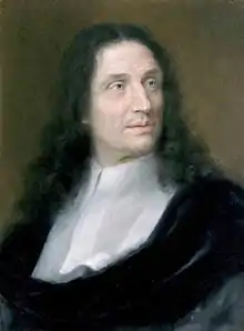 Vincenzo Viviani was born in Florence to the nobles Jacopo di Michelangelo Viviani and Maria Alamanno del Nente. While attending a Jesuit school Viviani studied the humanities. Following the study of humanities, Viviani turned to mathematics. He studied geometry under the instruction of Galilean follower Clemente Settimi.[2] It was through Clemente that Viviani would gain recognition and meet Clemente's instructor, Tuscan Court mathematician Famiano Michelini.[2] In 1638, Michelini initiated the Grand Duke Ferdinand II de’ Medici's interest in Viviani and arranged their introduction in Livorno where Viviani would demonstrate his abilities. The Grand Duke offered Viviani a monthly salary to continue his education and introduced him to Galileo, whose deteriorating health required a capable and competent assistant.[2] Later that year, Viviani was able to expand his knowledge over the philosophy of nature while assisting Galileo on Two new sciences, in which Galileo studied the acceleration of free bodies along an inclined plane.[2] Their frequent exchange over the subject inspired Galileo to elaborate on the mathematical theory and complete his demonstration on free bodies that would establish its connection to nature. Viviani would later use similar applications of mathematics in nature during a collaboration with Nicolaus Steno.[3]