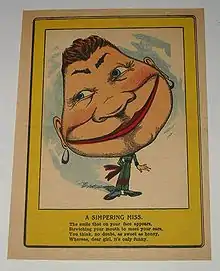 The unflattering cards reportedly created a stir throughout all social levels, sometimes provoking fisticuffs and arguments. The receiver, not the sender, was responsible for the cost of postage up until the 1840s. A person in those days paid for the privilege of being insulted by an often anonymous "admirer." Millions of vinegar valentines, with verses that insulted a person's looks, intelligence, or occupation, were sold between the 19th and 20th centuries. Art and design historian Annebella Pollen has extensively researched their production and reception in Britain, where they were more commonly called 'mock' or 'mocking' valentines.[2]
