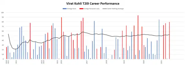 India conceded a 3–1 defeat in the five-match Test series against England. Kohli fared poorly in the series averaging just 13.40 in 10 innings scoring 134 runs overall with a top score of 39.[191] It was a nightmare tour for him as he was dismissed for single-digit scores on six occasions in the series and was particularly susceptible to the swinging ball on off stump line, being dismissed several times edging the ball to the wicket-keeper or slip fielders. Man of the series James Anderson got Kohli's wicket four times,[192] while Kohli's batting technique was questioned by analysts and former cricketers.[193][194] India won the ODI series that followed 3–1, but Kohli's struggles with the bat continued with an average of 18 in four innings.[195] In the one-off T20I, he scored 41-ball 66, his first fifty-plus score of the tour. India lost the match by three runs, but Kohli reached the number one spot for T20I batsmen in the ICC rankings.[196]