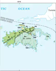 Located at the east end of the Greater Antilles, St. John resides on the northeastern end of the Caribbean Plate. The island formed during the Cretaceous with the eruption of the Water Island Formation, consisting of keratophyres and pillow basalts. Igneous activity then changed to that of an island arc, characterized by the Louisenhoj Formation, consisting of andesite and basalt. Volcanism abated during the deposition of the Outer Brass Limestone. Volcanism resumed as evidenced by the Late Cretaceous Tutu Formation, consisting of volcaniclastic turbidites, basalt, and andesite. A diabase dike swarm followed and then compressive folding attributed to the Caribbean Plate colliding with the Bahama Platform. The Late Eocene saw the intrusion of Narrows pluton and Virgin Gorda batholith, associated with the Greater Antilles arc magmatism, and more compressive folding associated with the spreading of the Cayman Trough. This spreading is also tied to sinistral strike-slip faulting at 39 Ma.[22]