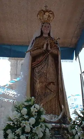 Normally, the statue is dressed in a cape. of which it owns many, and a large crown that was given to the statue in 1975. It also has pierced ears, earrings, and many finger rings in addition to the scepter it carries. A silver crescent moon with a "man in the moon" face looking up at her has been put at the base of the image to confirm its identity as an Immaculate Conception.
