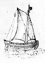 There is a small 17th-century sketch of a pinnace on John Hunt's October 8, 1607, map of Fort St George at the Popham Colony in midcoast Maine - see image.[5] This map was found in an archive in Spain, deposited there by a well-intentioned spy at an unknown date. This boat is thought to be the 30-ton pinnace Virginia that was built in 1607–1608 at the Popham colony on the Sagadahoc River (now Kennebec River) in southern Maine. Assuredly, lofting was done by 'eye'. Assembly was done under the direction of shipwright Digby of London.[6]