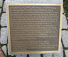 The Virginia Civil Rights Memorial is a monument in Richmond, Virginia, commemorating protests which helped bring about school desegregation in the state.[1] The memorial was opened in July 2008, and is located on the grounds of the Virginia State Capitol. It features eighteen statues of leaders or participants in the Civil Rights Movement on four sides of a rectangular granite stone block onto which are carved quotes.[2] The memorial was designed by Stanley Bleifeld, who was chosen by the commission behind the construction of the monument.[3] The memorial cost $2.8 million which was financed by private donations.[2]