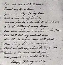 Virginia and Poe were by all accounts a happy and devoted couple. Poe's one-time employer George Rex Graham wrote of their relationship: "His love for his wife was a sort of rapturous worship of the spirit of beauty."[36] Poe once wrote to a friend, "I see no one among the living as beautiful as my little wife."[37] She, in turn, by many contemporary accounts, nearly idolized her husband.[38] She often sat close to him while he wrote, kept his pens in order, and folded and addressed his manuscripts.[39] She showed her love for Poe in an acrostic poem she composed when she was 23, dated February 14, 1846: