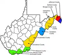 Since they were then under the military control of the Confederacy, Berkeley, Frederick, and Jefferson Counties never held votes on secession or the new West Virginia state constitution.[35] On January 31, 1863, the Restored Government of Virginia passed legislation authorizing the reorganized governor to hold elections in Berkeley County on whether or not to join West Virginia.[36] The Reorganized legislature similarly approved on February 4, 1863 an election for Jefferson County and others.[37] The elections were held, voters approved secession, and Berkeley and Jefferson Counties were admitted to West Virginia.[38]