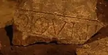 A second inscribed stone was discovered in 2001 by British Channel 4 Television's archaeological programme Time Team.[5] The stone was discovered as part of a late Roman or early Sub-Roman cist burial, being used as a side slab in the grave.[6] Located near the grave where the first inscribed stone was found, the inscription on this second stone reads: