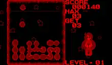 The main objective across every level is to make a determined number of linked worm pieces.[3] The player can also use the bottom and side edges of the playfield to make linked worm pieces disappear. If the worms pieces are linked in a certain way, a fairy will spawn to clear the bottom pieces in the playfield.[1][3][4] The game is over once any stack of worm pieces reaches the top of the playfield. The game gives a password after completing each level, but there is no dedicated screen to input them, rendering the passwords completely useless.[1][3][4][5]