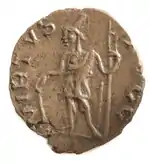 The deity was represented in a variety of ways, for example, on the coins of Tetricus, they could appear as a matron, an old man, or a young man, with a javelin, battle helmet, or only clothed in a cape. Within the realm of funerary reliefs Virtus is never shown without a male companion.[2] Often their presence within this realm of art is to compliment and provide assistance to the protagonist of the relief during a scene of intense masculinity or bravery.[3]