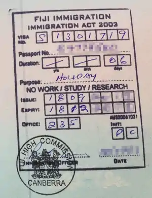 Visitors to Fiji must obtain a visa from one of the Fijian diplomatic missions unless they come from one of the 109 visa exempt countries.[1][2] All visitors must hold a passport valid for 6 months.